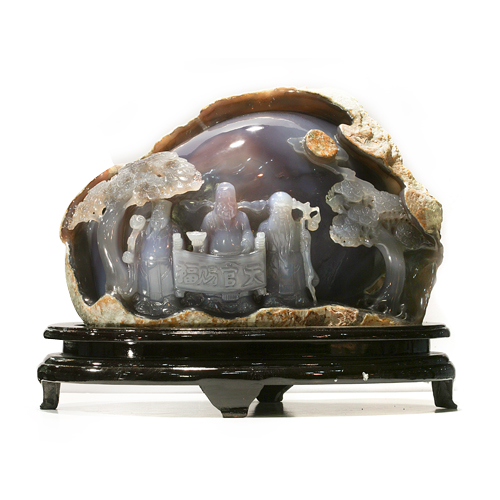 此款作品采用天然水膽瑪瑙精心巧雕而成,細膩滋潤,整體非常通透,清新自然。水膽瑪瑙,乃自然界形成的瑪瑙中包裹有天然形成的水,在瑪瑙制品中尤為稀罕。雕刻細致入微,生動活潑,栩栩如生。 為了表現水膽瑪瑙中的“水”,工藝大師們真是費盡心機,一件色澤亮麗、工藝精湛的水膽瑪瑙工藝品往往今人拍案叫絕。但如果雕琢時一不小心,將水膽雕破,就會前功盡棄。可見一件成功的水膽瑪瑙雕件其雕琢之難和其工藝價值之珍貴。