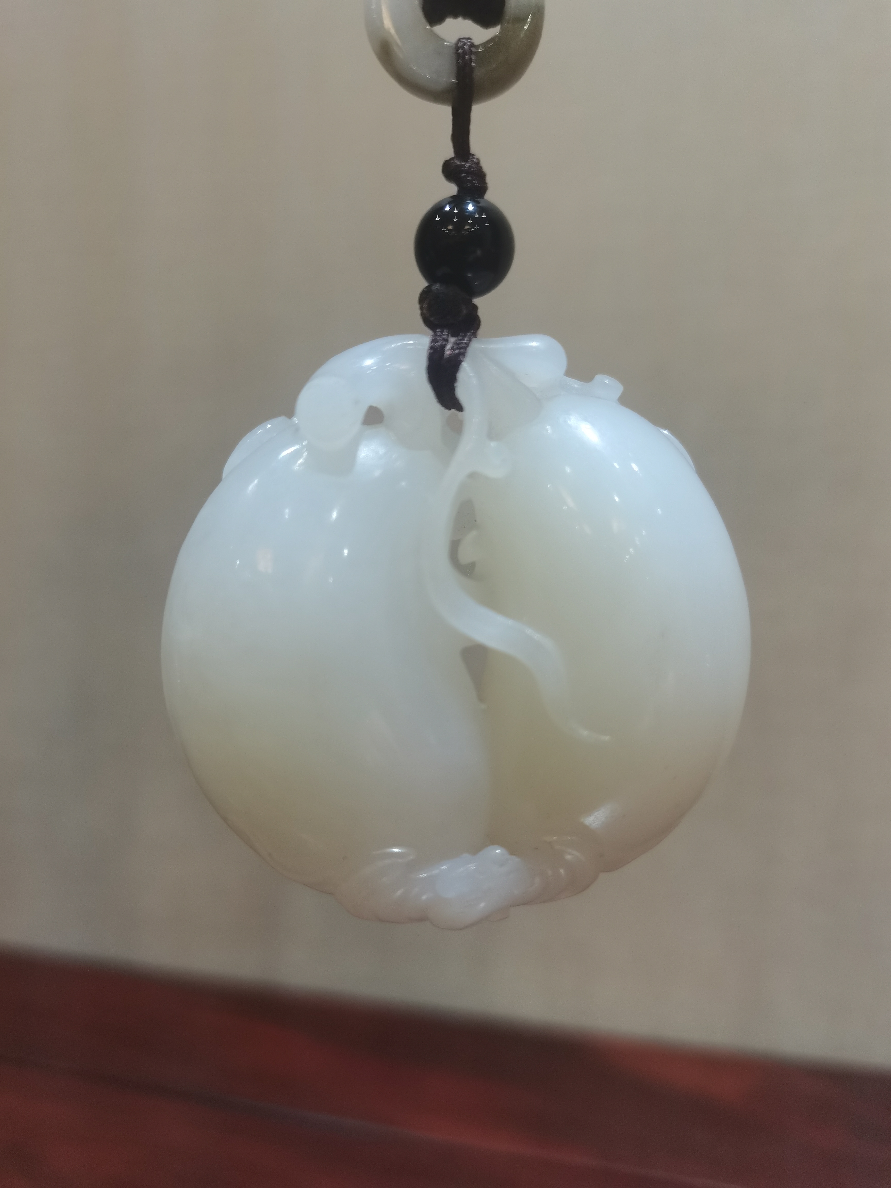 整件作品大小一手可握,色澤白皙柔和,玉質溫潤細膩,油性十足;雕刻大小兩顆瓜果與枝葉相連,飽滿圓潤,藤蔓纏繞,下方蝙蝠相連,象征幸福如意、福氣延綿無邊;中間鏤空造型,線條流暢。是極具佩戴、把玩、收藏之精品。