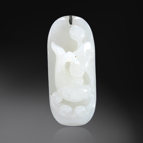 編號:RY32-311 通體玉質白潤,以高浮雕雕琢一尾鯉魚騰挪跳躍,下方浪花翻騰,動感十足,仿佛能感覺到畫面的蓬勃激情。古代傳說有鯉魚跳龍門的故事,凡是鯉魚能跳過龍門的,就可變化成龍;不能跳過龍門的,點額而歸,故黃河之鯉魚多有紅色的額頭,都是沒跳過龍門之魚。魚躍龍門表示青云得路,變化飛騰之意。