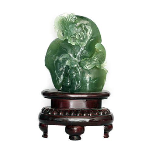 此件作品造型美觀大氣,雕工繁縟、技藝精湛。翠色清新亮麗,寓意吉祥討喜。兩只喜鵲于枝頭跳躍,回頭張望,四目相對(duì),含情脈脈,十分惹人喜愛(ài)。寓意喜事連連,喜上加喜!