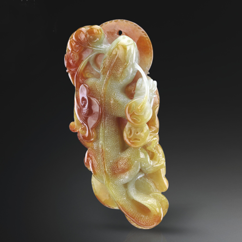 雕刻細致,翡色純正自然,蜥蜴扭身攀爬,充滿靈性。